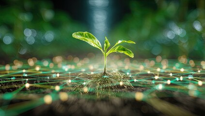 A vibrant sprout emerges from the earth, connected by a network of glowing lines