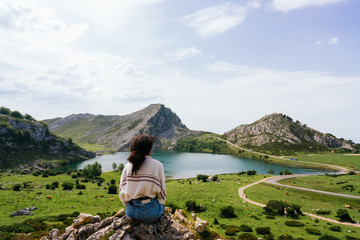 Happy brown skinned woman standing on a lake at Covadongas, in Europe Peaks in Asturias