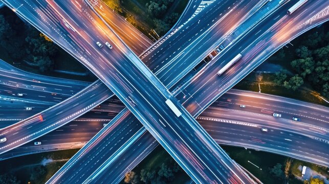 Top view of car traffic on multi-lane highways or expressways, traffic in roundabouts is part of everyday life. AI generated illustration.