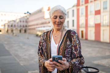 white haired woman using phone outdoors