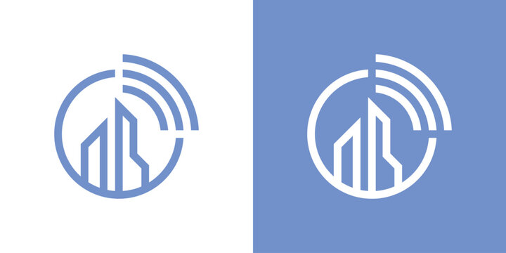 A modern logo combining a building and WiFi signal, symbolizing smart city, digital connectivity, and modern communication.