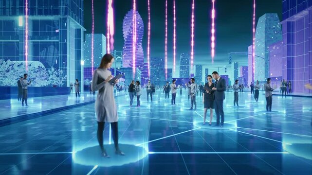 Virtual Meta City of People using Devices in Connected Social Network Wireless Futuristic World. Diverse Citizens do ecommerce, communication. Visualization of Information Lines Connecting Individuals