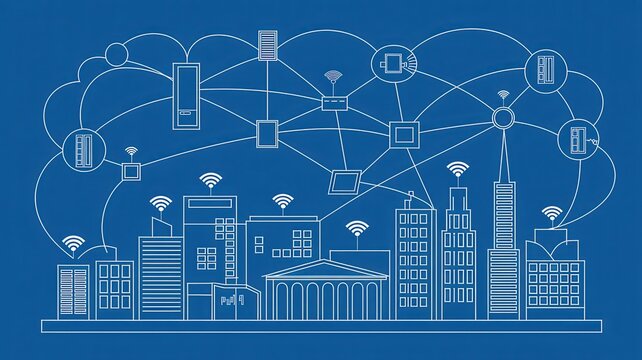 Modern city skyline with connected network of devices representing IoT connectivity solutions and smart urban technology, vibrant blue background