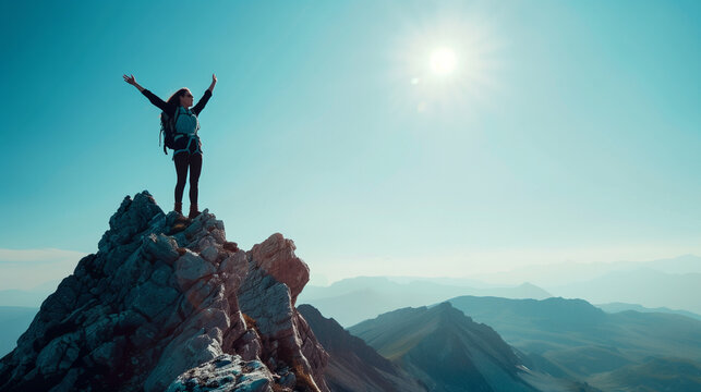 Solo climber conquers rugged peak, scaling barren heights with determination. Majestic mountain backdrop amplifies the triumph of the human spirit.
