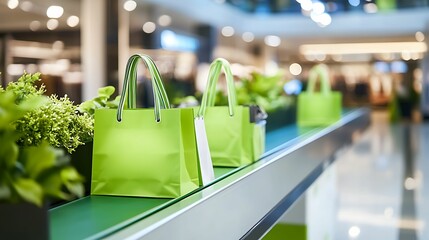 Green eco-friendly shopping bags displayed in a sleek retail environment, emphasizing sustainable consumerism and environmentally conscious shopping practices.