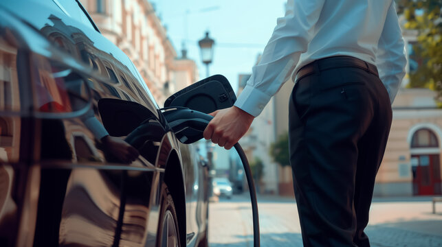 Businessman charges the electric vehicle at a city charging station. on a sunlit city street, embodying a commitment to a sustainable lifestyle.