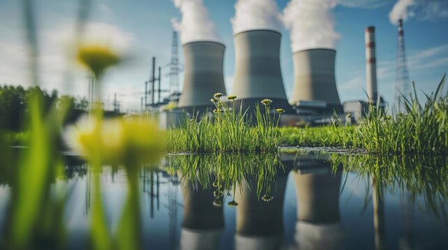 Ecofriendly factory using recyclable packaging materials, powered by a nearby hydro plant, showcasing CO2 reduction methods