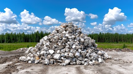 Pile of construction debris in a field under a clear sky. Possible use Stock photo for environmental issues, construction, or waste management