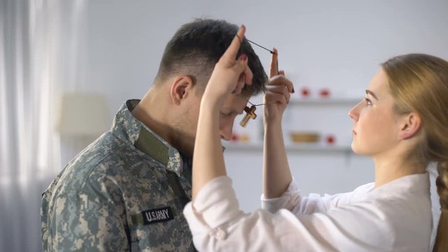 Upset woman wearing wooden cross necklace on male soldier and hugging, farewell