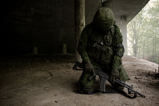 Indoor portrait of young girl wearing military uniform, mandatory conscription in Ukraine, Russian invasion, war concepts