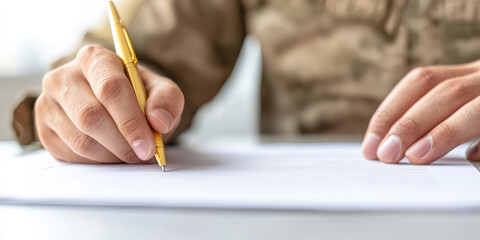 Male hands in military uniform filling out paperwork. Pen writing on paper, creatine concept of military enlistment office, conscription