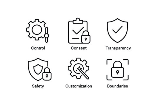 simple outline stroke icon items privacy settings (concepts): control consent transparency safety customization boundaries monoline icons style isolated on white background