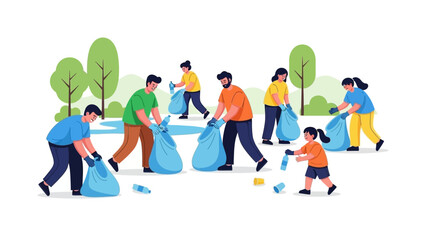 Community in Action: A vibrant illustration showcasing volunteers united in a park, collaboratively collecting litter, emphasizing the importance of environmental care and teamwork.