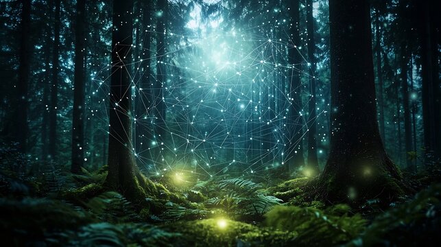 Smart sensor device installed in a lush forest landscape connected to a glowing network transmitting real time environmental data for monitoring and analytics
