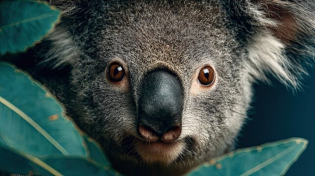 Wild koala conservation portrait with eucalyptus leaves, Australian wildlife protection nature concept for animal ads