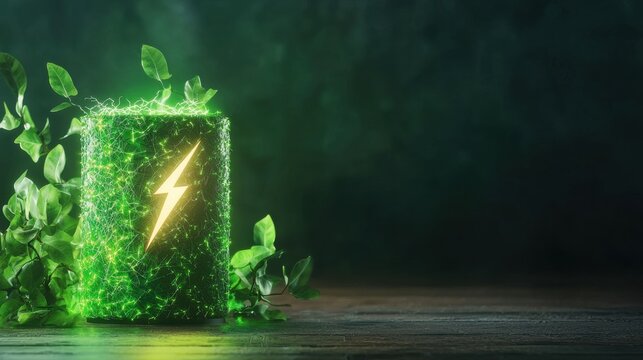 Sustainability Green Battery Green battery with a lightning bolt symbol, dark background, symbolizes clean energy and energy conservation