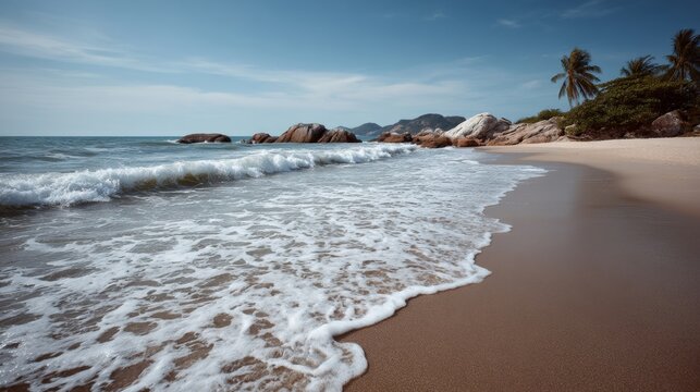 Tropical waves kiss the sunlit shore under the serene gaze of palm trees, evoking dreams of Pina Colada Day and Ocean Conservation Week