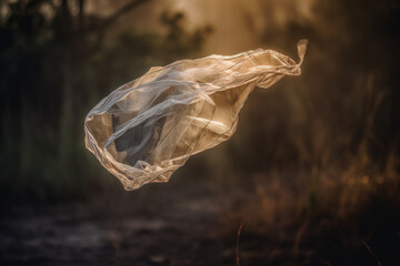 Generative AI illustration of delicate plastic bag floats gracefully amidst the hazy light of a forest at dusk