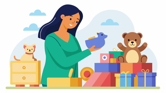A mother carefully inspects a collection of toys at a childrens consignment sale searching for the perfect gift for her sons upcoming birthday.. Vector illustration