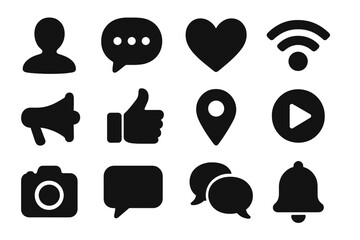 Social media silhouette icon set with communication and engagement symbols, vector cartoon illustration with transparent background, ordered collection for digital use and design