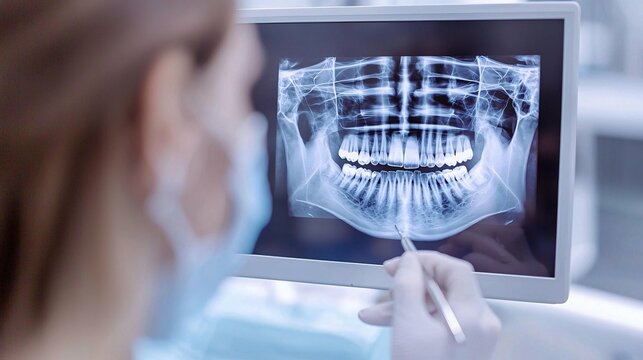Dental consultation brings smiles as a patient reviews her x-ray with a dentist in a modern clinic setting Generative AI