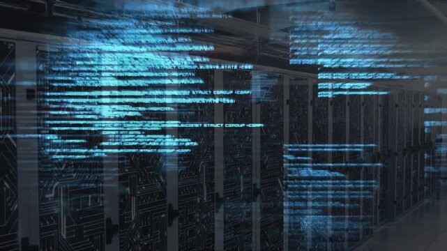 Initial holographic code fragments activating then streaming across racks representing data flow