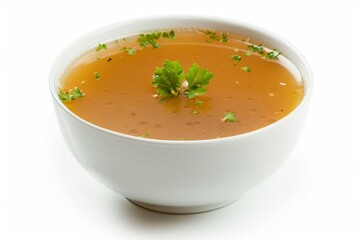 Clear soup in white bowl on white background