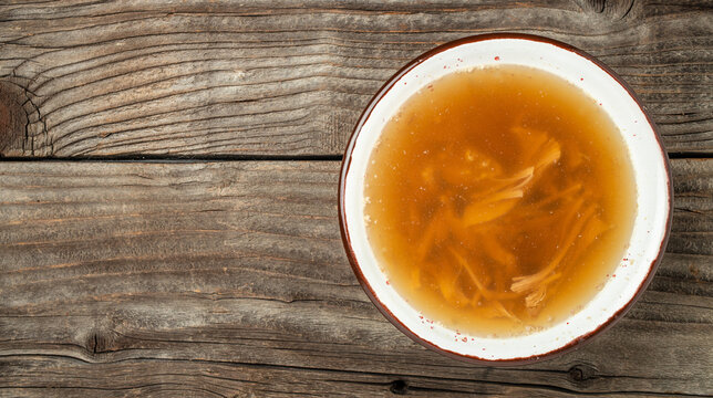 Hot consomme beef tail served in ceramic cup on rustic wooden table