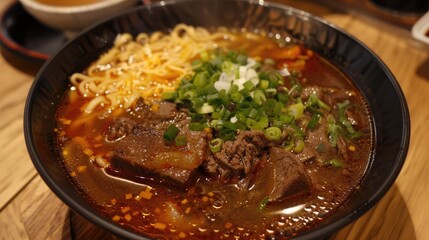 Birria ramen consomme soup with beef and noodle Mix of Mexican and Asian cuisine