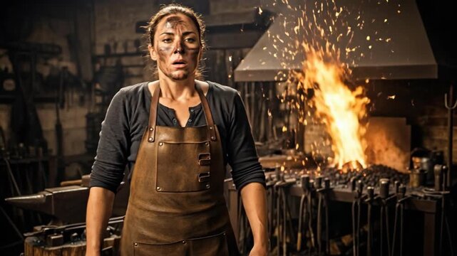 Woman blacksmith covered in soot wiping her forehead near a blazing forge with sparks flying. Heavy craftsmanship work.