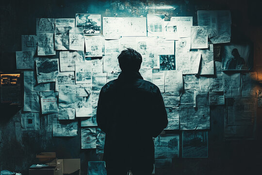 Crime investigation evidence wall with newspaper clippings, conspiracy theory, detective work, suspect connections, crime scene clues, red strings, forensic investigation, unsolved mystery case