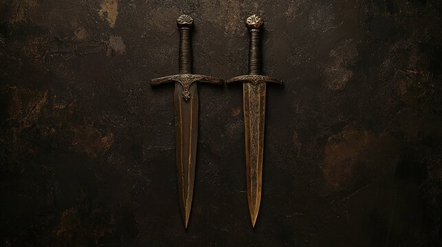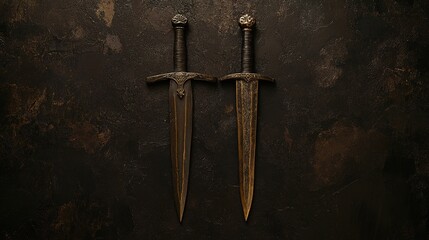 constancies. Two ancient bronze swords with complementary patina on a dark surface. event programs, museum guides, designed for cultural heritage projects and event programs.