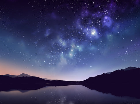 The Pleiades star cluster, also known as the Seven Sisters, shining brightly in the deep blue night sky. A beautiful astronomical view of a starfield and constellation.