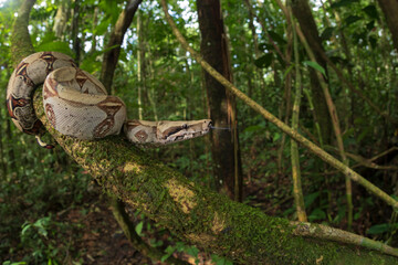 The boa constrictor (Boa constrictor), also called the red-tailed boa or the common boa, on the old branche.