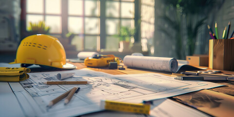 Close-up of a civil engineer's desk with blueprints and construction plans, illustrating a job in civil engineering