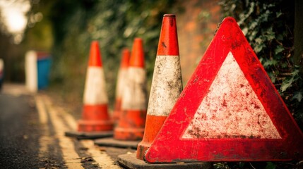 Traffic cones and warning signs placed on the roadside for safety measures