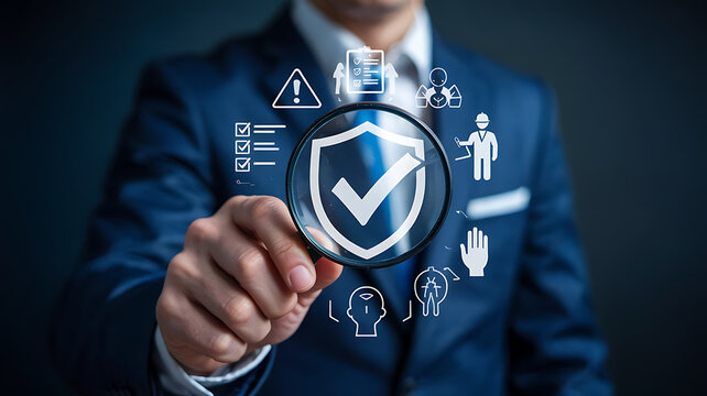 Compliance Check with Magnifying Glass, Business Security and Regulations, Risk Assessment, Quality Assurance, Audit, Man in Suit