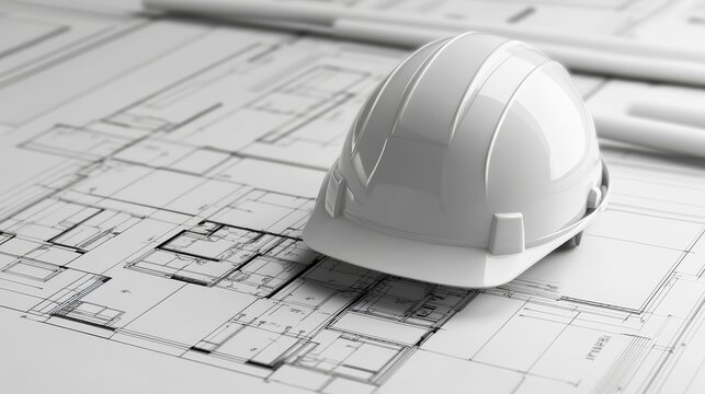 A close-up view of a white hard hat resting on architectural blueprints, symbolizing construction and engineering projects.