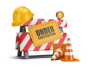 Project construction site, blueprints, hardhat and construction cones, banner. 3d illustration