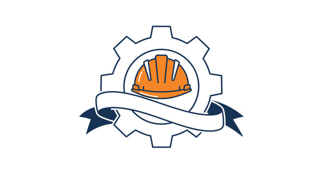 Vector illustration of an industrial emblem featuring a hard hat inside a gear with a blank ribbon banner