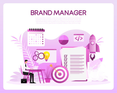 Brand manager in flat style. Employers working on branding. Reputation management. Vector illustration.