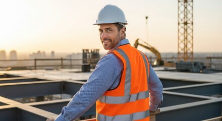 Confident Construction Site Manager Portrait on Skyscraper Roof at Golden Hour