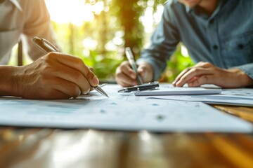 Two men in hard hats are examining a piece of paper. This image can be used to depict professionals discussing plans or reviewing important documents