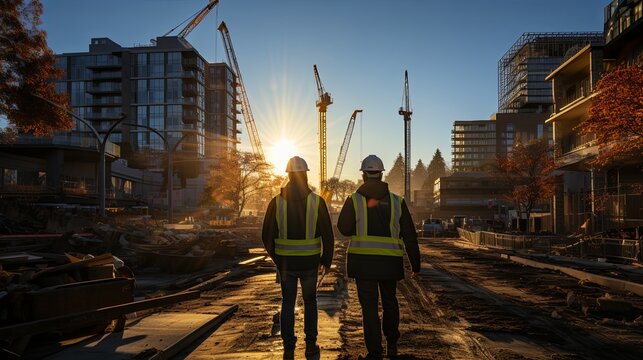 Two Professionals Discussing Plans in a Newly Constructed Industrial Workshop Space