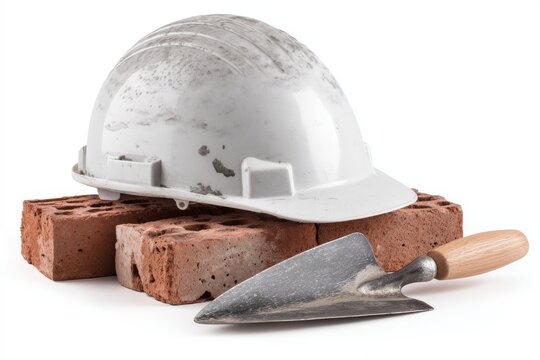 Construction materials and tools are arranged on a clean surface with a bright yellow hard hat and bricks during the course of a building project