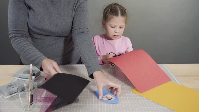 Time lapse. Little girl making a handmade Father's Day card from construction paper.