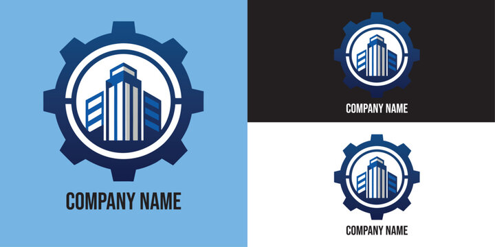 Vector art of a modern blue and white logo featuring a building inside a gear, symbolizing industry and construction
