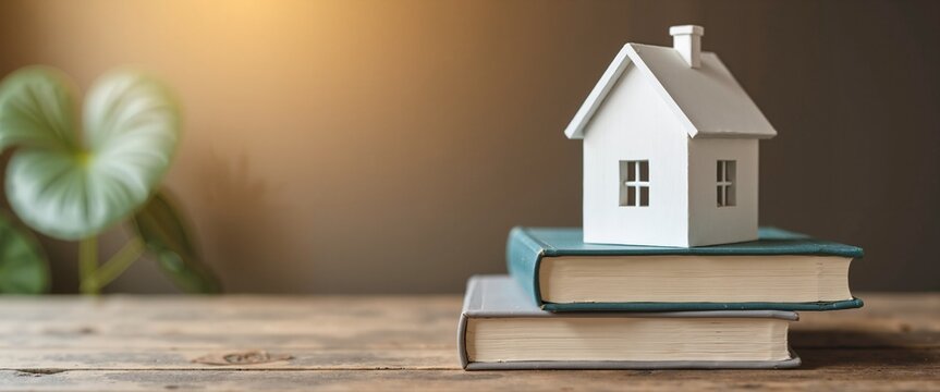 White miniature house model on books with warm lighting against wooden surface with copy space