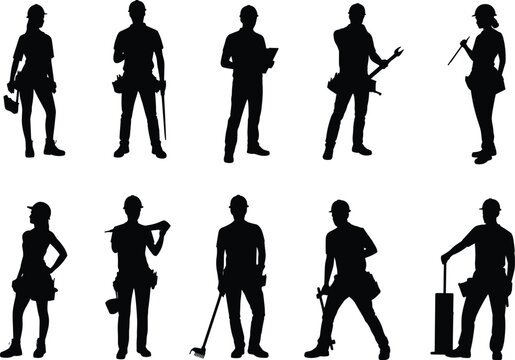 A collection of female construction workers and handymen in silhouette, holding tools and hard hats, for themes of construction, labor, and women in industry.