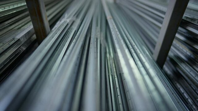 Manufactured stainless steel aluminum corner profiles lying in warehouse indoors. Live camera moves along construction building material stack in industrial storage